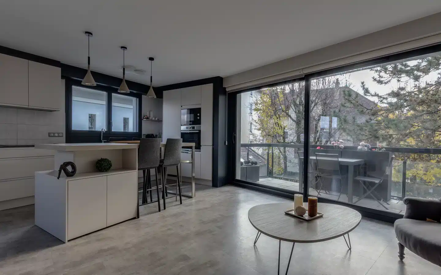 This high-quality property comprises a large entrance hall with storage space and separate WC, a main room with a fitted kitchen and central island opening onto a large 6.52 sqm south-facing balcony, a bedroom with a dressing room, and a bathroom.