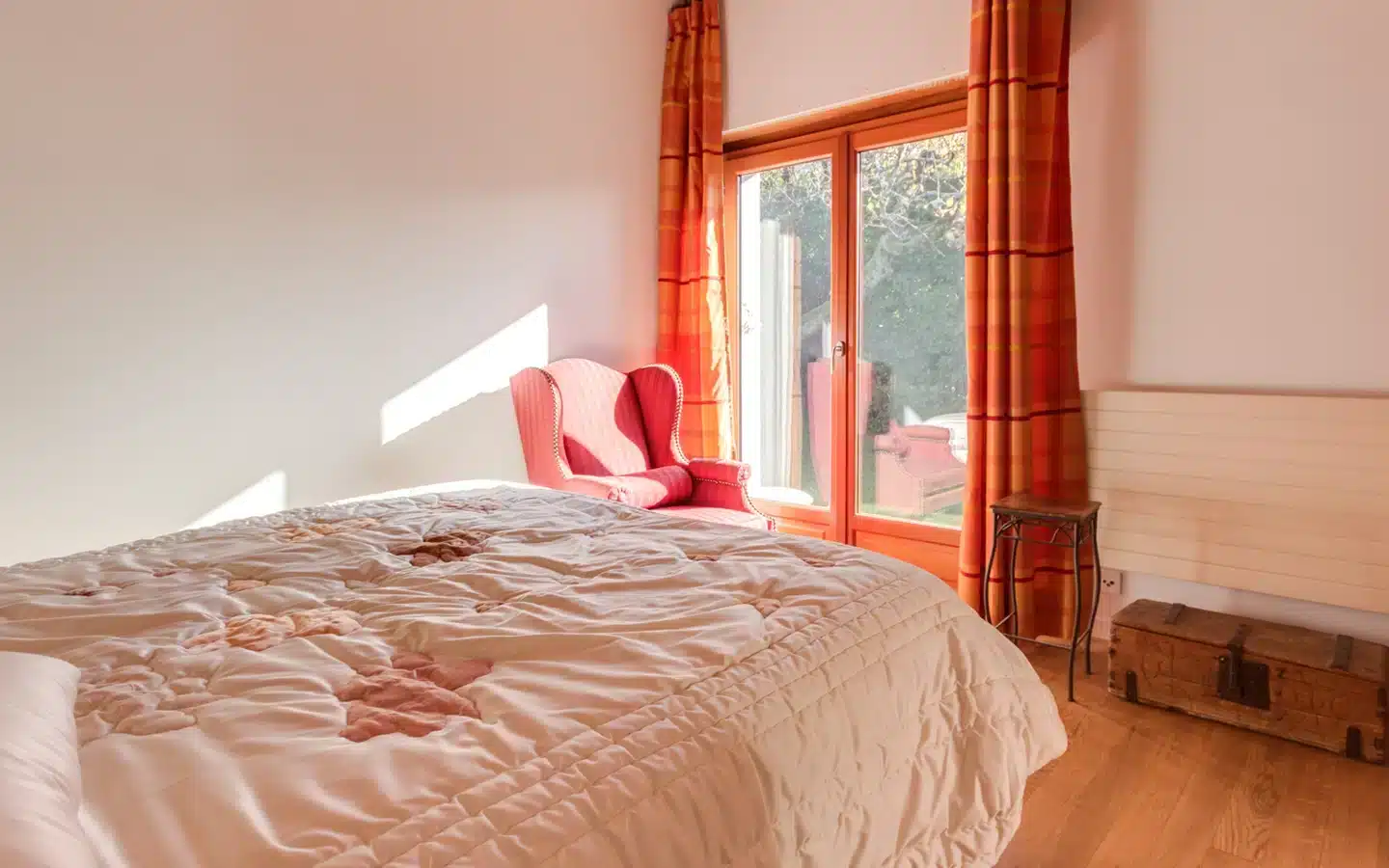 Upstairs, a master suite with bathroom and WC, three bedrooms, a shower room and a hallway with a wood-burning stove.
