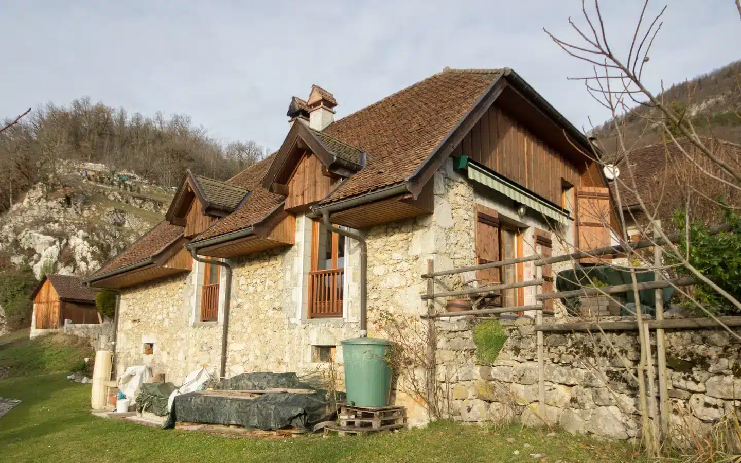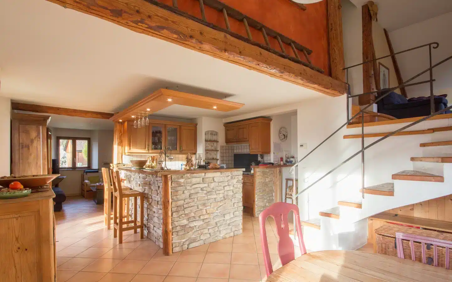 It comprises a living room with wood-burning stove, a dining room with open-plan fitted kitchen opening onto a terrace, 3 bedrooms, a shower room, a bathroom, a mezzanine with TV lounge, 2 separate WCs and plenty of storage space. The attic, which is partially convertible, offers additional space.