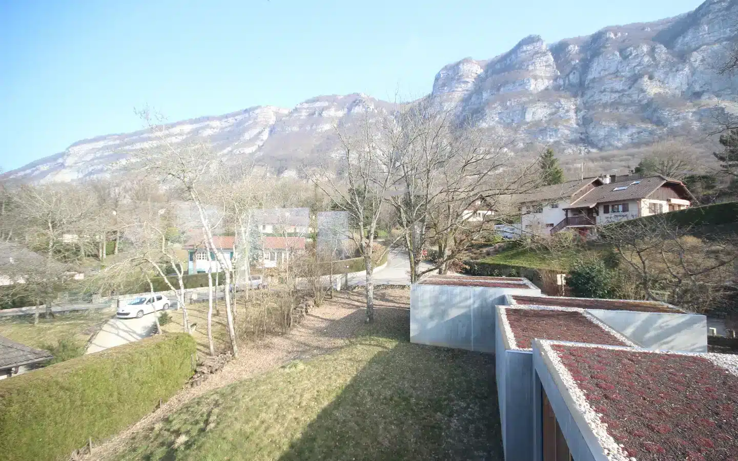 Magnificent new house with modern architecture, 265 sqm. Large living room with fitted kitchen and central fireplace, TV lounge area with unobstructed view, study, 5 bedrooms including a master suite, double garage. Wooded grounds of 1,295 sqm. Residential area and very quiet environment close to the golf course and 10 minutes from Geneva.