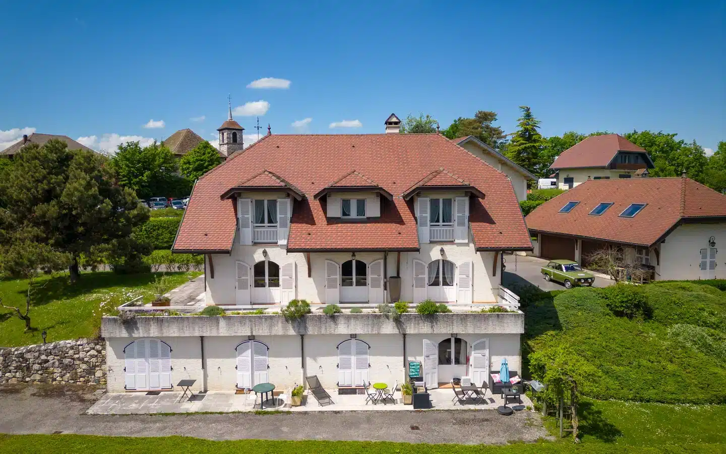 The 3 280 sqm grounds feature a paved courtyard, several parking spaces and a landscaped garden with trees, creating a pleasant and intimate setting.