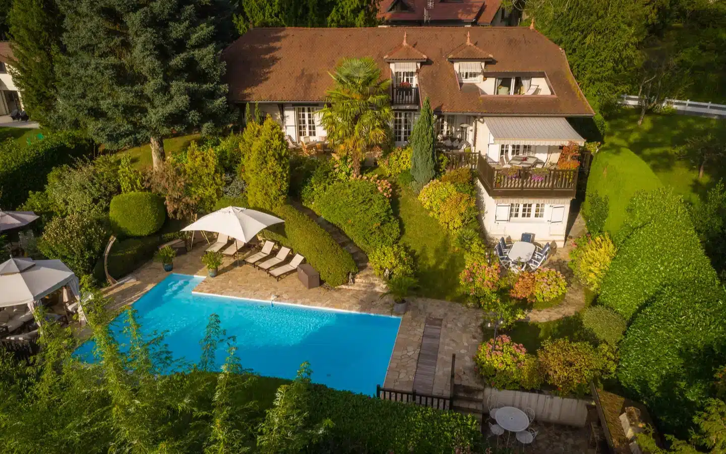 Magnificent property with over 270 sqm of living space located in a very residential area of the small port. Large 100 sqm living room with several lounges, fireplace and fitted kitchen, 4 bedrooms, an office, a mezzanine, garage and a separate 3-room apartment of 85 m². Various terraces allow you to enjoy the sun from morning until sunset. Pleasant landscaped grounds with trees covering 1,360 sqm with a heated infinity pool and barbecue area. Beautiful views of the lake, the Jura mountains, Annecy Castle and La Visitation. Highly sought-after, peaceful environment.