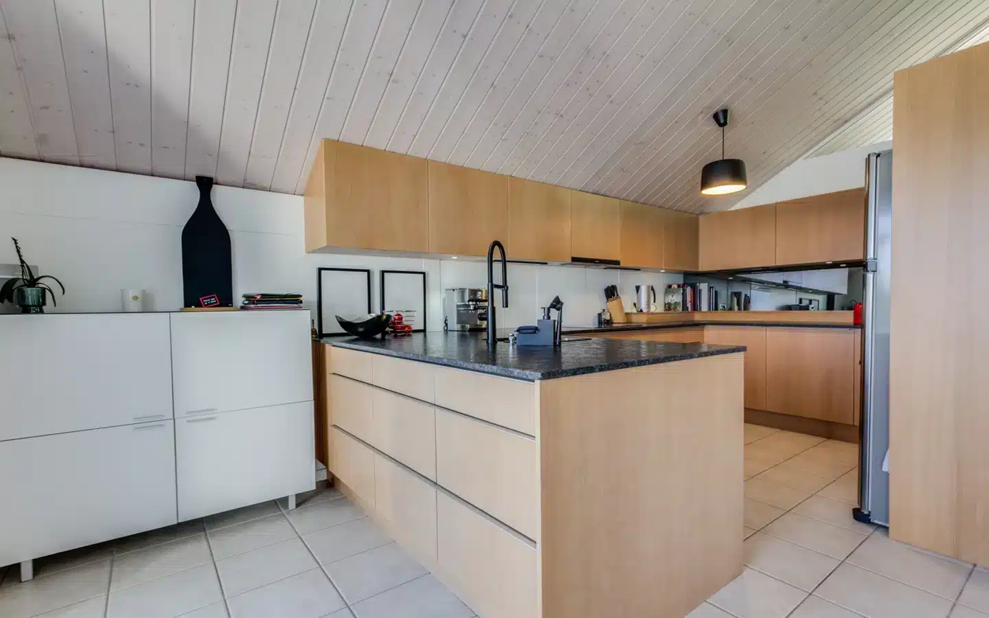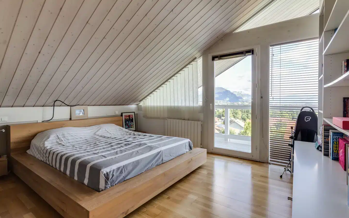 Upstairs, a mezzanine with office space opens onto a bedroom and a master suite with a dressing room, bathroom and balcony offering splendid views of the mountains.
