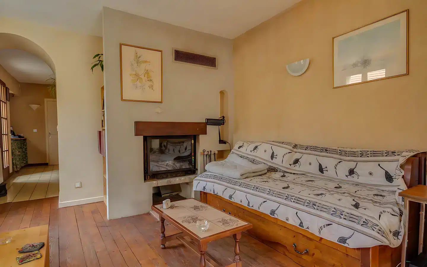 The property comprises a living room with a fireplace and access to a balcony overlooking the lake and the church, a fitted kitchen, a toilet and storage space.